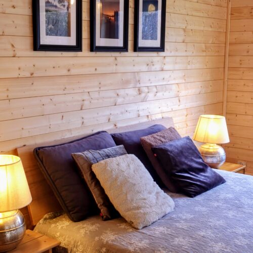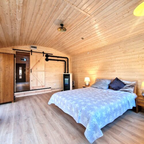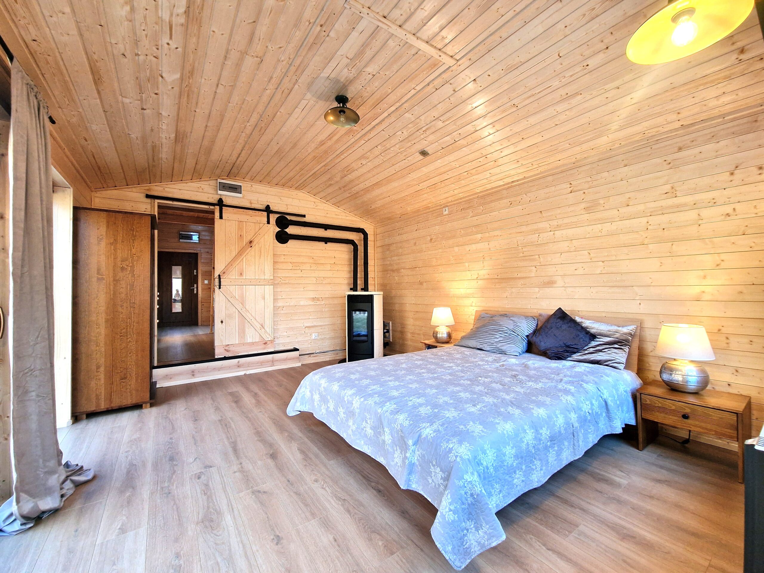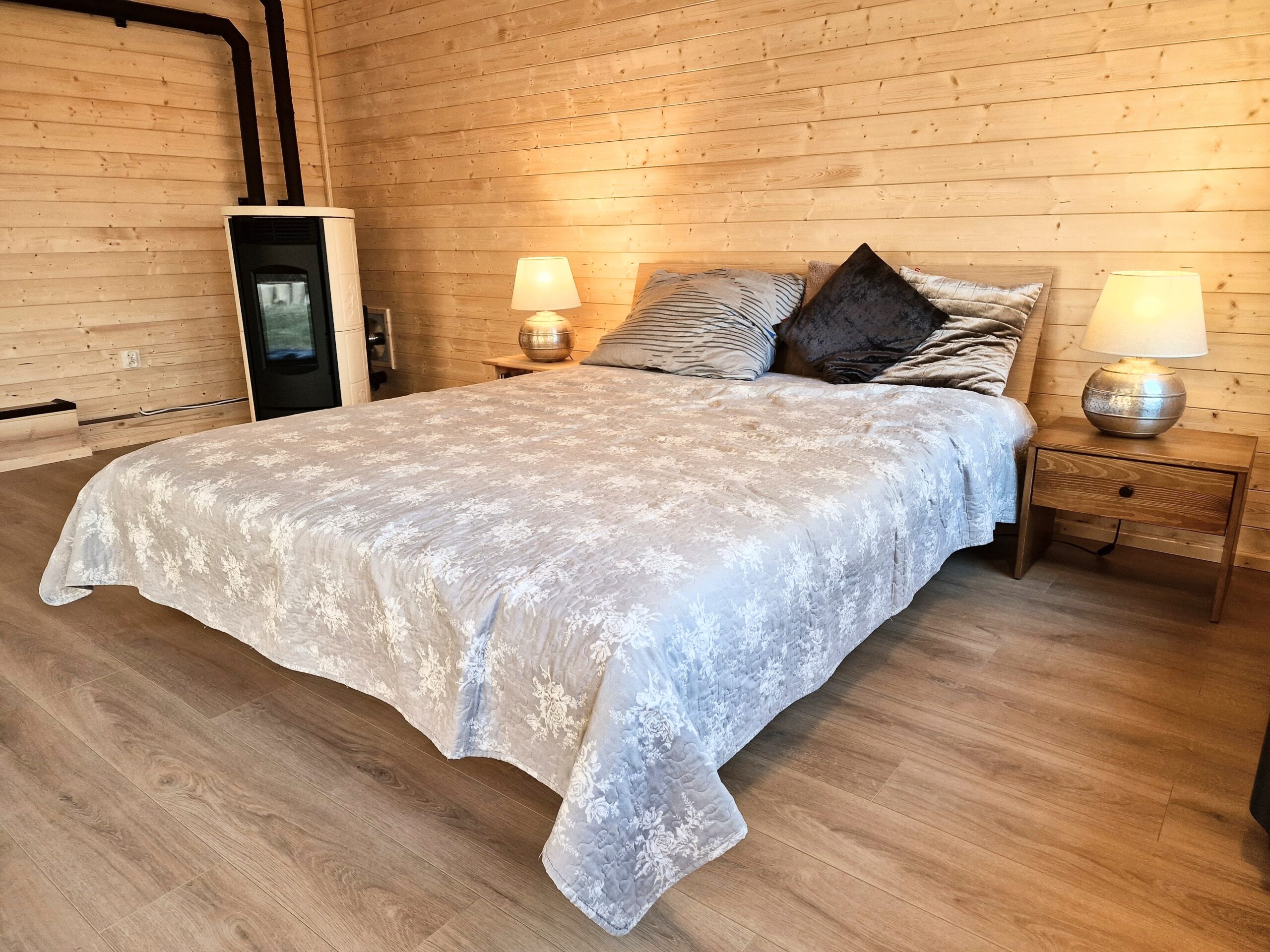 - 20 m² großes separates Schlafzimmer im Erdgeschoss mit Kamin, Filmprojektor und Doppelbett (1×160 cm).